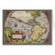 Vintage illustration antique world map featuring the Americas, 1570 by Abraham Ortelius. Abraham Ortelius (1527-1598) was a Flemish cartographer and geographer, generally recognized as the creator of the first modern atlas, the Theatrum Orbis Terrarum (Theatre of the World). He is also believed to be the first person to imagine that the continents were joined together before drifting to their present positions. This chart show continents, North, South and Central America, with the Pacific and Atlantic oceans and Antarctica. A beautiful ornate inset with the title Americae Sive Novi Orbis No Va Sescriptio is in the corner. Large ships with sails are navigating and traveling the seas.