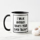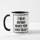 Funny slogan on a mug that says "I Value Antiques. what's YOUR super talent?". Two Tone Mug for an Antiques Valuer, Antique Shop Owner, or Antiques Expert. Black and white bold text.