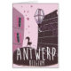 Antwerp, Belgium holiday travel poster cartoon of a cat walking down a old cobbled street or lane.