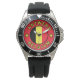 Has heft and feel of expensive stainless steel quartz wrist watches. Solid construction and good looks. Although it had a really top quality rubber strap, I substituted a stainless steel "Shark" style mesh strap, which I think is the most comfortable strap available. Perfect. True colors of original image. Clear, crisp image precisely aligned and spaced.