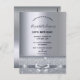 A modern, stylish and glamourous invitation for a woman's 50th or any age birthday party. A faux silver metallic looking background with an elegant faux silver bow, ribbon and sparkle. The name is written with a modern black hand lettered style script. Templates for a name, age and your party details.