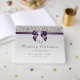 Elegant, personalised custom silver and purple any age birthday celebration guestbook with beautiful sequins, shiny printed bow and ribbon and pretty diamond bling jewel on a glamourous gold gradient background. PLEASE NOTE: These are flat printed graphics - no raised parts.If you need assistance customising your product please contact me through my store. I will be happy to help.