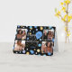 Create a stylish photo collage greetings card! Personalise the template with four favourite photos, the recipient's name, and birthday age. A fun design featuring round confetti, balloons, and "Happy Birthday" in a trendy script. Perfect for family, kids, friends, and pets! Printed colours: blue, black, white and gold.