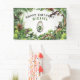 This fun and vibrant dinosaur-themed birthday banner design brings prehistoric excitement to life with a lush hand-painted watercolor jungle of green foliage and a variety of detailed dinosaurs surrounding a central cracked egg featuring the birthday age. The bold “Happy Birthday” message arches above the name in playful typography, perfectly suited for a dinosaur lover’s celebration. With flying pterosaurs and roaring T-Rexes, this dynamic design sets the stage for an adventurous party atmosphere, making it an ideal decoration for indoor or outdoor birthday festivities.