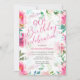 This tropical floral any age birthday celebration invitation features gorgeous watercolor peonies and roses in shades of pink and purple with teal and olive greenery. An opaque overlay of white with a cut out frame is the background for your party details in pink and grey modern script typography. For an example, we've chosen a 90th birthday celebration design to personalise for the age you would like. The back of the card has a matching floral pattern. Designed by artist Susan Coffey