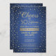 Invite family and friends to an elegant anniversary celebration with custom blue and gold party invitations. All wording on this template (including "Cheers to 50 Years") is set up for a 50th wedding anniversary, but is simple to personalize for any year or event type. The design features modern glittery confetti dots on a faux brushed metallic background, stylish script calligraphy, and classic vintage art deco typography. Please note that gold is printed color, not metallic foil. Happy Anniversary and cheers to the couple on their milestone celebration!