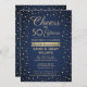 Invite family and friends to an elegant anniversary celebration with custom navy blue and gold party invitations. All wording on this template (including "Cheers to 50 Years") is set up for a 50th wedding anniversary, but is simple to personalize for any year or event type. The design features modern glittery confetti dots, stylish script calligraphy, and classic vintage art deco typography. Please note that gold is printed color, not metallic foil. Happy Anniversary and cheers to the couple on their milestone celebration!
