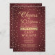 Invite family and friends to an elegant birthday celebration with custom burgundy and gold party invitations. All wording on this template (including "Cheers to 50 Years") is set up for a 50th birthday, but is simple to personalise for any year or event type. The design features modern glittery confetti dots on a dark red faux brushed metallic background, stylish script calligraphy, and classic vintage art deco typography. Please note that gold is printed colour, not metallic foil. The gender neutral design is also suitable for either a man or a woman. Cheers and Happy Birthday!