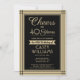 Invite family and friends to an elegant birthday celebration with custom black and gold party invitations. All wording on this template (including "Cheers to 40 Years") is set up for a 40th birthday, but is simple to personalise for any year or event type. The design features a modern striped border, stylish script calligraphy, and classic vintage art deco typography. Please note that gold is printed colour, not metallic foil. The gender neutral design is also suitable for either a man or a woman. Cheers and Happy Birthday!
