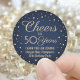 Add a personalised finishing touch to birthday party thank you notes or favours with custom navy blue and gold faux foil round stickers / envelope seals. All text is simple to customise or delete. This template is set up for a 50th birthday, but can easily be changed to another year or event, such as an anniversary. Design features gold faux foil confetti dots on a navy blue background, stylish script calligraphy "Cheers to 50 years," and modern minimalist typography customisable message at bottom. Please note that gold is printed colour, not metallic foil.
