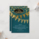 5th or any year birthday party invitation. Celebrate the special person in your life! Peacock teal blue and gold, jewel tone color way. Available in other colors. Elegant golden glitter banner pennants and confetti.