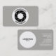 A business card template with an aperture symbol in a white circle with curved text company name and business type. Company name and business type on the front, with name and other contact details on the reverse using the white circle panel without the aperture symbol for the name and job title, arranged to the left side.