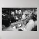 Overall view of Mission Operations Control Room in Mission Control Centre at the Manned Spacecraft Centre (MSC) during the ceremonies aboard the U.S.S. Iwo Jima, prime recovery ship for the Apollo 13 mission. Dr. Donald K. Slayton (in black shirt, left of centre), Director of Flight Crew Operations at MSC, and Chester M. Lee of the Apollo Program Directorate, Office of Manned Space Flight, NASA Headquarters, shake hands, while Dr. Rocco A. Petrone, Apollo Program Director, Office of Manned Space Flight, NASA Headquarters (standing, near Lee), watches the large screen showing Astronaut James A. Lovell Jr., Apollo 13 commander, during the on-board ceremonies. In the foreground, Glynn S. Lunney (extreme left) and Eugene F. Kranz (smoking a cigar), two Apollo 13 Flight Directors, view the activity from their consoles.