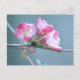 A photograph of an apple tree branch with pink apple blossoms on a blue/grey background.