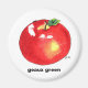 refrigerator magnet of an organic red apple with a little ladybug on it doing her job and a friendly cajun message.
