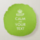 Cute apple green and white keep calm and your text round throw pillow. Personalizable template for making your own funny keep calm and carry on parody. Vintage keepcalm typography with little crown. Create your own keepcalmandcarryon spoof. Funny home decor for sofa couch or bed. Customise lime colour / colour. Double sided design.
