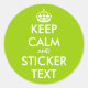 Apple green round Keep Calm Stickers | personalizable. Customisable Keepcalm template with custom background colour and text. Vintage Keepcalmandcarryon theme. Create your own Keep calm parody.