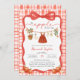 The design is highlighted by a playful red ribbon and scalloped border, giving it a touch of elegance and charm. Personalize all the text details, including the mom-to-be’s name, event date, time, and venue, for a fully customized look.