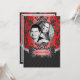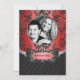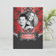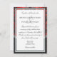 Apple Red & Black Damask Wedding Invitations---match the RSVP cards & entire suite found at the bottom of this page. Each invitation features an elegant, chandelier like damask print in black and deep apple red at the top with a luxury pillow print, also in black at the bottom. The top and bottom half are seperated by a silver and black ornamental band for added flair. The band has a template that allows the groom & bride's first names to be printed on top of it. These red chandier/black damask wedding invitations are set to high quality basic card stock; however, you can change the stock to linen, felt (embossed), recycled, and several metallic shades if you would like under number 2 (choose your style, size & paper type) below the orange add to cart button. A list of the additional costs for a fancier card stock are displayed also under that option. Each invitation comes with a fitted white envelope.