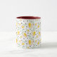 Stylised apples and seeds scattered on a coffee mug accented with red handle and interior.