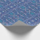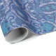 Wrapping paper featuring fresh and elegant pattern, stylised apples, leaves and whimsical striped curves, bohemian / ethnic / hippie / vintage style, hand drawn pastel texture. Colour palette: cold blue shades - indigo, denim, azure.