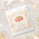 Send guests home with a sweet reminder of your special day using this charming favour bag from the “The Apple of Our Eye” collection. Featuring a sweet trio of patterned orange, red, and pink apples with a heart detail on a soft ivory background, this bag can be personalised with the mum-to-be’s name for a thoughtful touch. The fall-inspired look matches perfectly with the invitations and party décor. Ideal for holding treats, small gifts, or keepsakes, it’s a delightful addition to a baby girl’s orchard or rustic-themed shower.