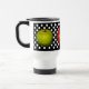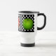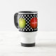 Fun teacher's travel mug, with pretty graphics of three different coloured patterned apples, against a black and white polka dot background. White text is ready to personalise. Great for yourself or as a gift idea for your favourite teacher.