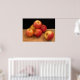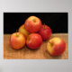 This poster features a very simple still life composition of six beautiful shiny red and yellow apples on a straw mat against a black background.