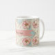 A floral applique patchwork pattern with pink and ivory flowers roughly stitched onto blue and ivory fabric, with worn, ecru lace gives this mug a shabby and chic look that you will love. Resembles and old quilt, forgotten in an attic. Very feminine, perfect for anyone who loves stitching.