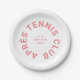 Après Tennis Club custom pink crest paper plates. Personalise with the year, tennis club / championship / tournament name and location. Perfect for a Wimbledon or tennis open party, for a local tennis club party or for a tennis themed bachelor, bachelorette or birthday party. Designed to match our Après Tennis Social Club Collection.
