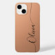 Apricot Shimmer Black Elegant Calligraphy Script Custom Personalised Name iPhone 14 Smart Phone Cases features a modern and trendy simple and stylish design with your personalised name in elegant hand written calligraphy script typography on a metallic apricot shimmer background. Designed by ©Evco Studio www.zazzle.com/store/evcostudio