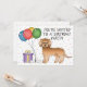 Cute birthday theme design featuring Destei's original cartoon illustration of a cute apricot coat colour miniature Goldendoodle breed dog. Next to the dog there are colourful birthday balloons tied on a dog bone and a purple and yellow colour present box. The background has a playful pattern of colourful pastel confetti on a white background. Personalise the sample text areas with the details of your event.