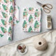 On this Holiday wrapping paper, an adorable little apricot Poodle dog wears a red and white Santa hat, and sits in front of a decorated Holiday tree. The image is repeated across the surface, and there are red snowflakes and striped candy canes between the images. There is also red text that says "Merry Christmas". Everything is placed on a white background.