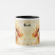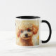 This colourful mug celebrates the adorable miniature Poodle dog! Two sides of the mug have a beautiful portrait of an apricot Poodle Dog against an abstract background. Predominant colours are orange, yellow, and creamy white. At the centre is script that says Poodle, but you may change it or even personalise it, if you wish. This mug will get noticed!