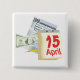 This design features April 15th as tax day. Shown on this design are a 1040 form, a $100. dollar bill, a pencil and a calendar with April 15th on it, shown in big red letters. This pin or button can be used as a reminder to the day of April 15th coming up. Available in assorted shapes and sizes.