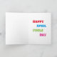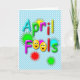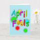 Fun bright April Fools Day card. Colourful letters with two smiley facec on the O's in FOOL. Background is blue with white polka dots.