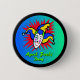 Teal, blue and black circle background with multi coloured jester in centre and words April fool's written below in green.
