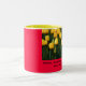 This is a beautiful mug with a yellow inside and red on the outside with a refreshing picture of spring tulips and the famous saying "April showers bring May flowers"
