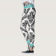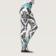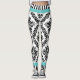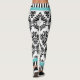 Black and white damask pattern and stripes leggings. A cute retro black and white damask pattern, a n aqua blue band and black and white stripes on the top and bottom adorn this cool pair of leggings.