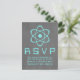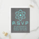 Cute and nerdy Atomic Chalkboard Wedding Response Card featuring a simple atomic symbol in turquoise on a chalkboard look background. This geeky and fun wedding RSVP postcard is perfect for the science enthusiast couple! Easy to customise, simply add the details of your wedding in the spaces provided. Click "Customise It" to find more personalisation options.