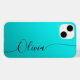 Aqua Shimmer Black Elegant Calligraphy Script Custom Personalised Name iPhone 14 Smart Phone Cases features a modern and trendy simple and stylish design with your personalised name in elegant hand written calligraphy script typography on a metallic aqua shimmer background. Designed by ©Evco Studio www.zazzle.com/store/evcostudio