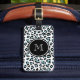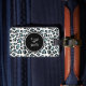 This trendy, fun, black and aqua blue leopard spots animal print pattern is a perfect background for a black and white circle tag with your initial on it in white text in an elegant font. GraphicsByMimi© Personalise this bold, stylish, girly leopard print design with your monogram, text, initial or name. Use the template field or use the "customise it" option for a full edit menu. A . Other colours available.
