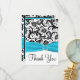This black and white damask Thank You card has an aqua blue PRINTED ribbon and PRINTED diamond jewel brooch that would be perfect for an aqua and black themed wedding. ****PLEASE NOTE if you change fonts, or the size of the font, some of the design and/or text may get cut-off. Everything will print as you see it on your monitor. I will not see changes you make, and Zazzle will NOT correct anything (typos, mis-alignment etc.). The text is all customisable. If you need help with this product, please email me BEFORE you place your order. If you require any other matching items, please email your request to niteowlstudio@gmail.com