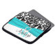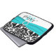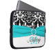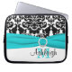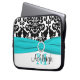 This personalised black and white damask laptop sleeve with an aqua blue FAUX ribbon and jewel brooch has text boxes for you to customise with your own name, monograms, business name, or other text. If you need any help customising, please email niteowlstudio@gmail.com.
