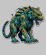 This is illustration of futuristic warrior tiger character named "Aqua Blaze," presented in mesmerizing aqua and yellowish-golden hues. This powerful and agile tiger has sleek armor that reflects its vibrant colors, with intricate patterns resembling waves to symbolize speed and agility. Its eyes glow with determination, and it possesses technological accessories that enhance its strength and dexterity. On the backside of Aqua Blaze, feature the typographic design: "In the found space where aqua tigers zip and zoom, The fated twirl starts up the adventure's boom!"