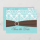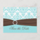 This aqua blue, brown, and white damask Save the Date postcard matches the wedding invitation shown below. If you require any other matching items in this design, please email me your request.