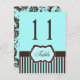 This aqua blue, brown, and white stripes and floral damask table number postcard matches the wedding invitation shown below. You must change the number 11 to each number that you need, add it to your cart, and then come back and repeat the process with each number that you need. Quantity discounts may apply once you add all the items to your cart. If you have any questions, contact me at niteowlstudio@gmail.com.