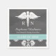 Rustic and pretty chalkboard style damask lace medical school graduation party paper napkin with a caduceus flanked by the letters RN in a chalk look artwork style and a printed aqua blue and white stitched ribbon look design. Customise it with the name of the graduate, nursing school name and class year on this registered nurse party supply. Artwork © Chrissy H. Studios, LLC. All rights Reserved.