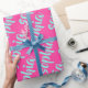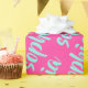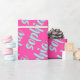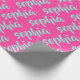 Wrapping paper featuring a custom name in an aqua blue script font on a hot pink background. Bold and colourful design.