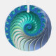 An artsy design that makes a perfect suncatcher for your window with a nautilus shell spiral fractal in shades of blue.